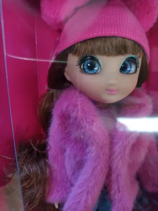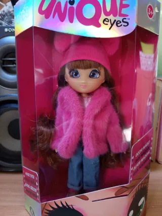 Muñeca de colección Unique Eyes con ojos mágicos. - Incluye sombrero rosa con orejas. - Abrigo de pelo sintético rosa. - Pantalones vaqueros.