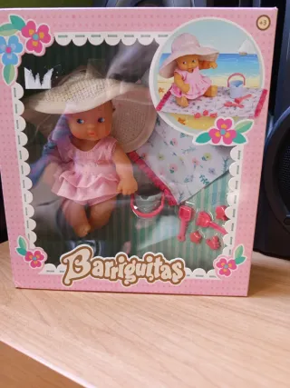 Muñeca Barriguitas con temática de playa, lista para disfrutar del verano. - Incluye vestido rosa y sombrero. - Accesorios de playa como cubo y pala. - Toalla con estampado floral.