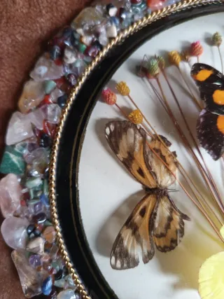 Precioso cuadro decorativo con mariposas preservadas. - Marco circular con detalles de piedras semipreciosas. - Mariposas de diferentes colores y tamaños. - Cristal protector.