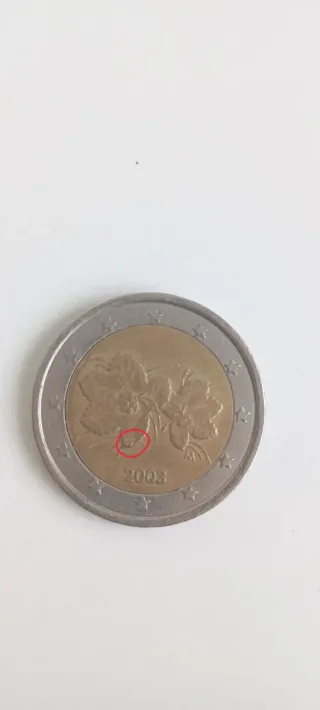 Moneda de 2 euros conmemorativa del año 2003. - Diseño de dos flores. - Presenta un error de acuñación, EXCESO DE METAL