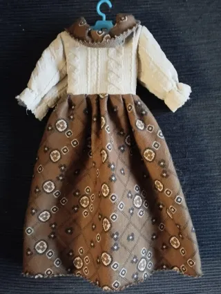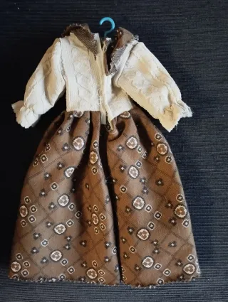 Vestido de invierno para Nancy de los años 80. El vestido es de punto con estampado. Incluyo percha. - Parte superior de punto trenzado en color crudo. - Falda con estampado de rombos en marrón y detalles florales. - Cuello con volante y detalle de punto. - Mangas largas abullonadas con puño.