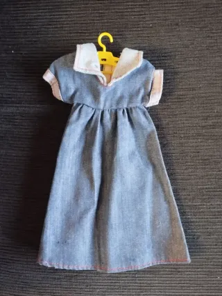 Vestido de verano para muñeca Nancy de los años 80. Confeccionado en tela vaquera con cuello blanco. Incluyo percha. - Diseño de manga corta. - Falda con vuelo. - Cuelga-vestidos amarillo incluido.