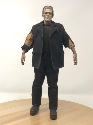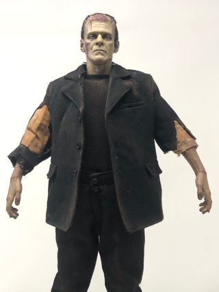 inspirado en La Novia de Frankenstein 1935. pieza única La cabeza ha sido modificada y pintada con acabado realista reasaltando la textura de quemaduras y cicatrices. El pelo enraizado aporta un aspecto natural y fiel al personaje. brazos, sin juntas visibles en las muñecas, han sido adaptados y repintados; cuerpo articulado que incluye relleno para reproducir la corpulencia característica del monstruo. El traje camisa y botas cuentan con tratamientos de desgaste y ensuciado, replicando los daños tras las quemaduras sufridas en la primera película de Frankenstein. Todo ello está realizado para lograr la estica autentica del film