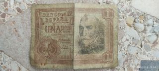 Billete de 1 peseta del Banco de España, emitido en Madrid el 22 de julio de 1953. - Anverso: Retrato de un personaje histórico. - Reverso: Valor del billete y sello del Banco de España.