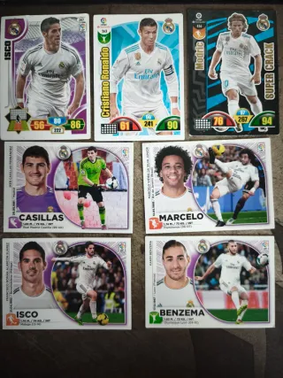 Colección de cromos de jugadores del Real Madrid. - Incluye a Isco, Cristiano Ronaldo, Modric, Casillas, Marcelo y Benzema. - Cromos de la colección de fútbol.