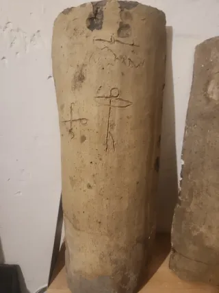 2 Teules manuals antigues amb inscripcions – Vic (s. XVII) 2 Teules manuals antigues de fang cuit, procedent del casc antic de Vic, amb inscripcions gravades abans de la cuita. S’hi llegeix la paraula “teuler”, corresponent a marca d’ofici del teuler, juntament amb símbols gravats (creus i traços). Peça artesanal, irregular, amb pàtina original i marques del temps, no restaurada. Aquest tipus de teules eren col·locades en edificis antics i, en alguns casos, signades pel propi artesà, fet poc habitual.
