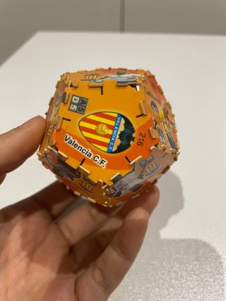 Puzzle 3D con forma de balón del Valencia C.F. - Diseño esférico. - Decorado con el escudo y colores del club. - Piezas de cartón.