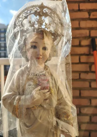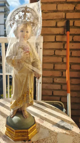Figura religiosa del niño Jesús de Praga. - Detalle de bordados dorados en la túnica. - Representación con túnica y manto.