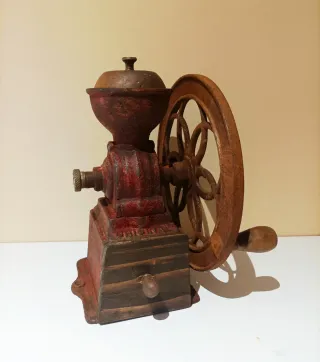 Molinillo de café antiguo, con un diseño robusto y un acabado en rojo desgastado. - Cuerpo principal de hierro fundido. - Cajón extraíble para el café molido, funcionando y completo