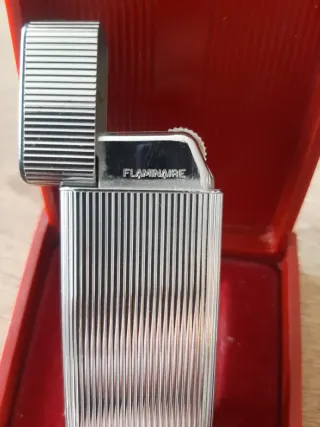 Encenedor Flaminaire original, fabricació francesa, estil retro anys 60–70. Metall cromat amb línies verticals. - Diseño clásico y elegante. - Incluye la caja original. -Li falta gas. (Precio negociable)