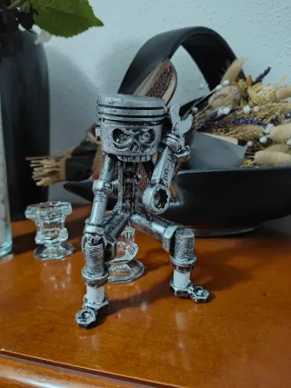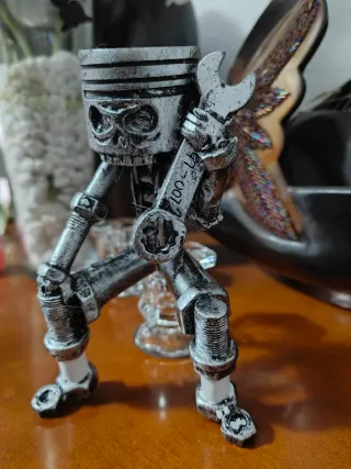 Figura decorativa con diseño de pistón y calavera, inspirada en la mecánica. - Fabricada en metal con acabado plateado. - Detalle de llave inglesa. X
