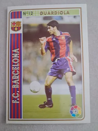 Carta coleccionable de Pep Guardiola del FC Barcelona de la temporada 1994-1995. - Número 12. - Incluye escudo del FC Barcelona. - Diseño con franjas verticales rojas y azules.