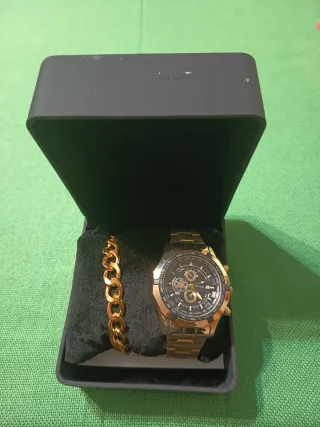 Elegante conjunto de reloj Geneva y pulsera a juego. - Reloj de pulsera con correa y esfera dorada. - Pulsera de eslabones dorados.