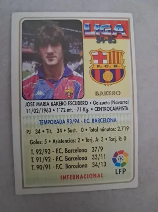 Carta coleccionable del futbolista Bakero, temporada 1994-1995, del FC Barcelona. - Número 15. - Incluye escudo del FC Barcelona. - Logo de la LFP.