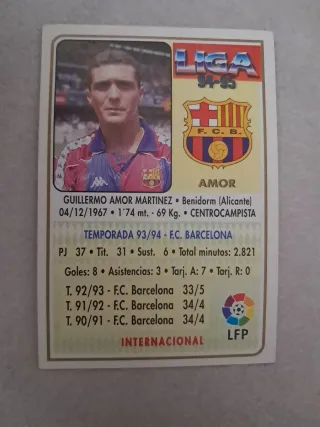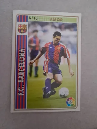Carta de fútbol del jugador Amor del FC Barcelona de la temporada 1994-1995. - Número 13. - Incluye escudo del FC Barcelona. - Diseño con los colores del club.