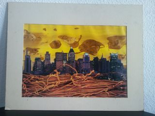 Obra de arte original Cambalache SXXI del artista Carlos E. Donés. - Técnica mixta con collage. - Representación surrealista con figura humana y paisaje. - Firmado por el artista en el certificado de autenticidad