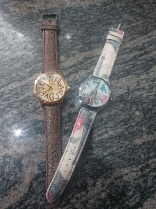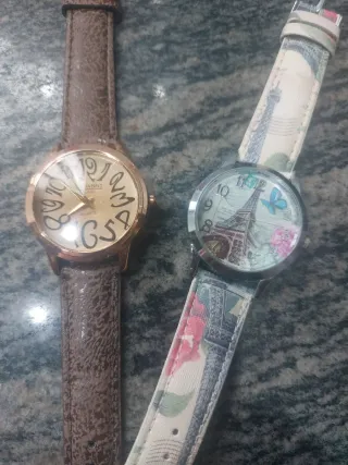 Dos relojes de pulsera con diseños únicos. - Un reloj con correa marrón y esfera con números grandes. - Otro reloj con correa estampada con flores y Torre Eiffel. - Precio las 2 unidades juntas -Disponobles mas modelos