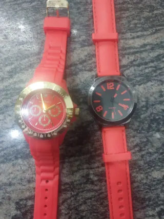 Dos relojes con correas de silicona en color rojo. - Un reloj con esfera dorada y detalles en rojo. - Otro reloj con esfera negra y números rojos.