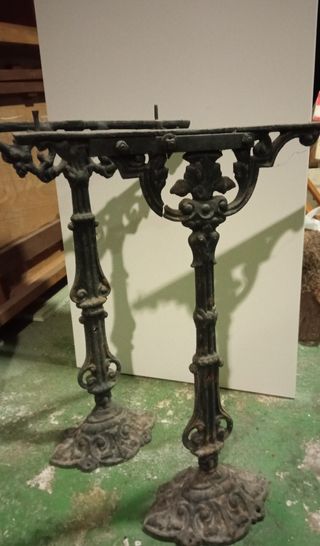 Conjunto de dos pies antiguos de fundición con un diseño ornamentado y bases decorativas. - Material: Hierro fundido. - Estilo: Clásico. - Color: Negro (con pátina de tiempo). - Base: Amplia y decorada con motivos florales/ornamentales. - Tallo: Elaborado con detalles. - Parte superior: Preparada para soportar una superficie.