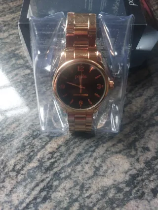 Elegante reloj de pulsera con acabado en oro rosa. Presentado en su caja original. - Diseño moderno y sofisticado. - Correa de eslabones. - Esfera redonda.