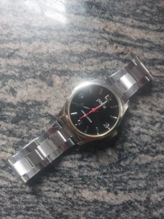 Elegante reloj de pulsera con esfera plateada y correa negra. - Diseño moderno y atractivo. - Correa de material resistente.