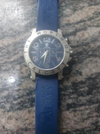 Reloj con correa azul y esfera azul. - Correa de goma con el texto THE WORLD OF CALGARY. - Bisel plateado con números. - Esfera azul con detalles plateados.