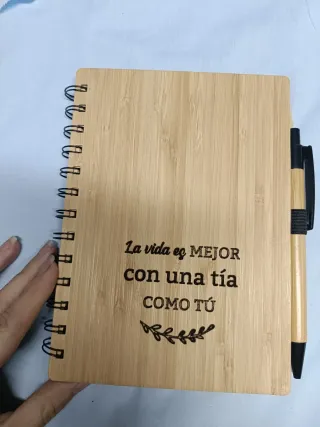 Libreta de bambú con un diseño especial para regalar a una tía. - Tapa de madera de bambú. - Mensaje grabado: La vida es mejor con una tía como tú. - Incluye un bolígrafo de bambú sujeto con goma elástica. Es nueva resto de stock