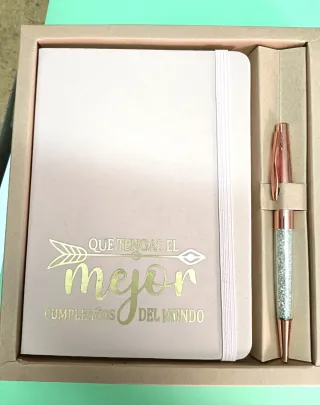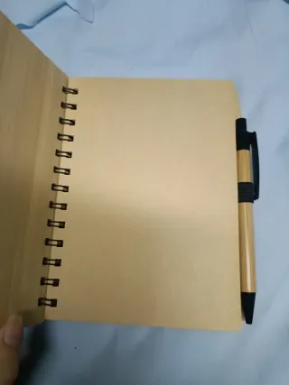 Libreta con tapa de bambú grabada con un mensaje de cumpleaños. - Tapa de bambú con grabado láser. - Encuadernación en espiral. - Incluye un bolígrafo sujeto con goma elástica. Es nueva, resto de stock de tienda