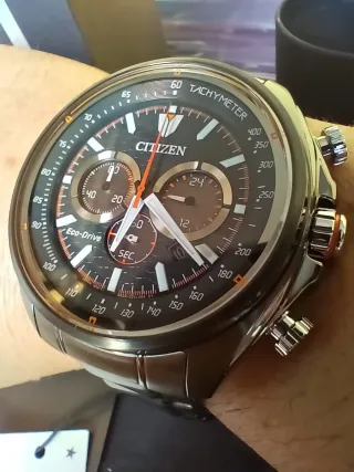Reloj Citizen Eco Drive, nuevo y en su caja original. ECO-DRIVE (Tecnología de carga solar), reloj cronógrafo, función de calendario: fecha, solar, cronómetro, pantalla de 24 horas, manecillas luminosas y taquímetro Este reloj de alta calidad tiene una correa de acero inoxidable gris (21 cm de largo y 22 mm de ancho) con un cierre desplegable con cierre a presión Diámetro de la caja: 45 mm, Altura de la caja: 12 mm, Color de la carcasa: Gris, Color de la esfera: Gris Resistente al agua: 10 bares. Peso: 176 g