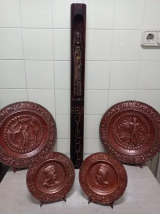 Conjunto de piezas decorativas de estilo antiguo, ideal para añadir un toque rústico a tu hogar. - Dos platos grandes con relieves de escenas del Quijote y Sancho Panza - Dos platos pequeños con perfiles de figuras históricas Los Reyes Católicos. - Una figura de madera tallada con inscripción vertical. San Pedro.Buen estado. Hago envíos.