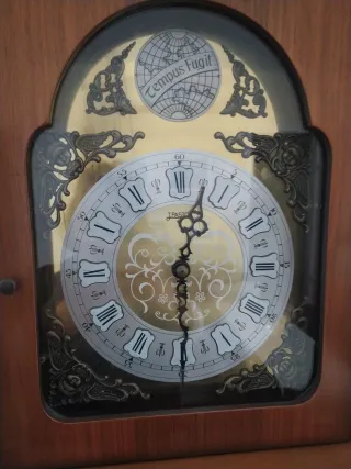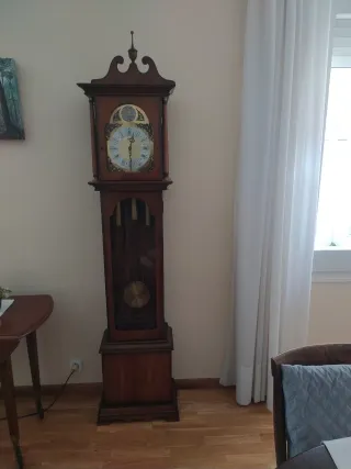 Elegante reloj de pie de madera con un diseño clásico. - Esfera con números romanos. - Péndulo visible en la parte inferior. - Acabado en madera oscura.Venta en Barcelona