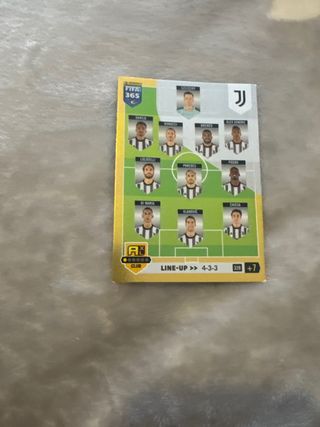 Carta coleccionable dorada de la alineación del Juventus. - Edición FIFA 365. - Muestra la formación 4-3-3. - Incluye jugadores como Szczesny, Danilo, Bonucci, Bremer, Alex Sandro, Locatelli, Paredes, Pogba, Di Maria, Vlahovic y Chiesa.