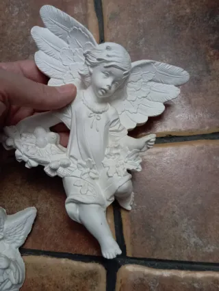Lote de angeles ceramica yeso y resina. Para colgar repisa escritorio baño etc.. unos 8 cm 12 cm 8 cm aprox. Lote de 4 unidades 2 de ellos para poner vela tienen alguna reparación.