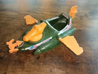 Vehículo de juguete Wind Raider de Top Toys. Un clásico para coleccionistas. Tiene un ala pegada y la otra rota Funciona el mecanismo de recoger la cuerda - Diseño inspirado en naves. - Piezas de plástico de color verde y naranja. Másters juyba motu bootleg tmnt street sharks mighty max Heman