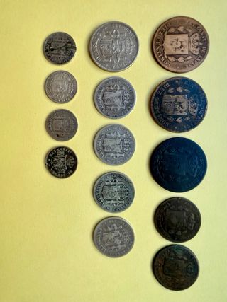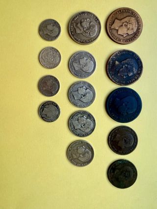 Conjunto de monedas de Alfonso XII. - 10 cts 1877, 1878, 1879 - 5 cts 1877, 1879 - 2 pts 1882 - 1 pts 1876, 1882, 1883, 1885 - 50 cts 1880, 1885 - 10 centavos de peso 1885 - Monedas de plata