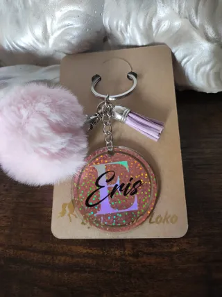Llavero acrílico con diseño personalizado y un suave pompón. - Diseño circular con inicial y nombre. - Acabado brillante con purpurina. - Incluye pompón rosa y detalle de borla. - Cierre de anilla metálica. - Sellado todo con resina UV.