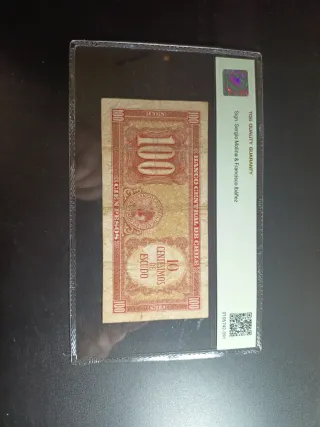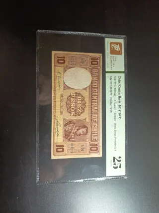 Billete de 10 pesos chilenos del Banco Central de Chile, emitido en 1947. - Pick: 111/B245a2 - Sello: TOG QUALITY GUARANTY - Grado: 25 Very Fine - Anverso: Retrato de personaje histórico y DIEZ PESOS - Reverso: BANCO CENTRAL DE CHILE - Marca de agua: Diego Portales & X