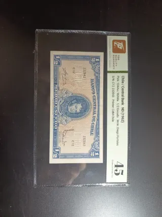 Billete de 1/2 Escudo del Banco Central de Chile, emitido en 1962. - Pick: 134Aa/B268a - Serie: C12 232843 - Impresor: CdM-Chile - Marca de agua: Diego Portales - Grado: 45 Choice Extremely Fine