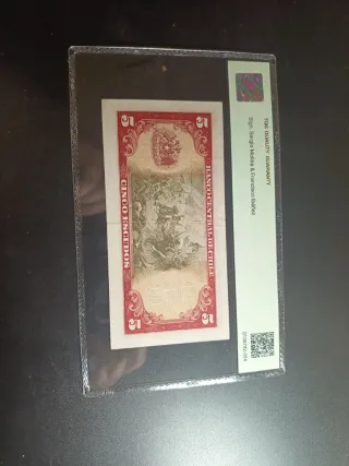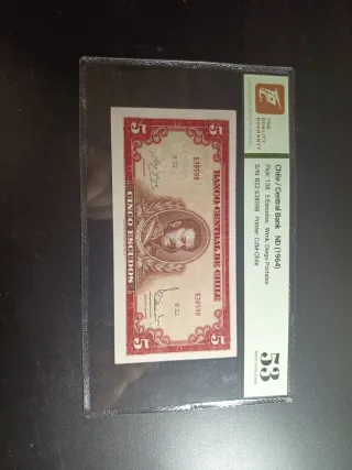 Billete de Chile, Banco Central, de 5 Escudos, emitido en 1964. Certificado por TCG con un grado de 53. - Pick: 138 - Serie: B22 638598 - Impresor: CdM-Chile - Marca de agua: Diego Portales