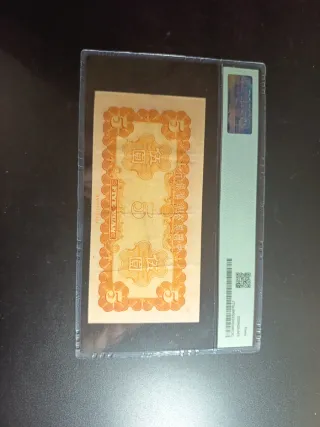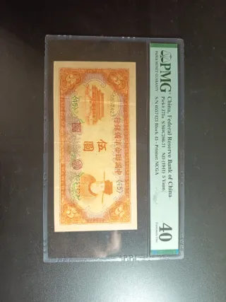 Billete de 5 Yuan del Banco Federal de Reserva de China, emitido en 1941. Se encuentra en una cápsula protectora de PMG. - Pick# J73a - S/M#C286-71 - S/N 0557423 Block 45 - Grado PMG: 40 Extremely Fine
