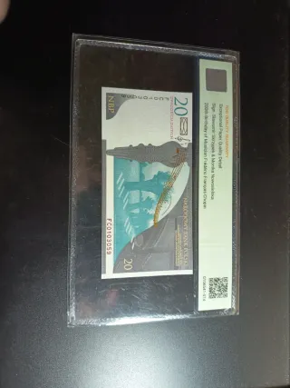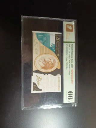 Billete conmemorativo de 20 Zlotych de Polonia, emitido en 2009. - Diseño dedicado a Frédéric Chopin. - Incluye número de serie FC0103059. - Calificación: 66 Gem Uncirculated.