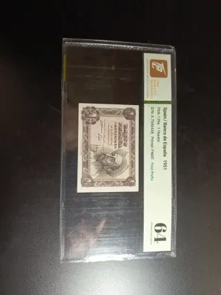Billete de 1 Peseta de España, emitido en 1951 por el Banco de España. Se encuentra en una funda protectora. - Referencia Pick: 139a - Serie: A 7690438 - Impresor: FNMT - Grado: 64 Choice Uncirculated