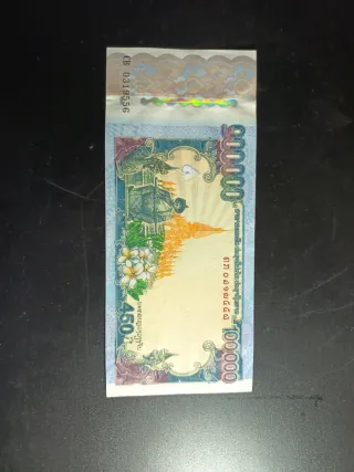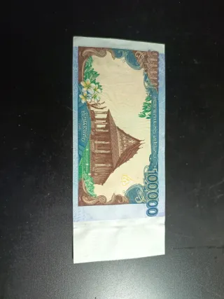 Billete de 100,000 Kip de Laos. Presenta un diseño detallado con motivos culturales. - Denominación: 100,000 Kip - Serie: CB 0319556 - Diseño: Paisaje y flores de plumeria