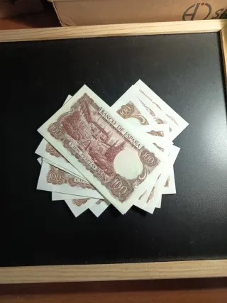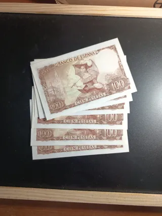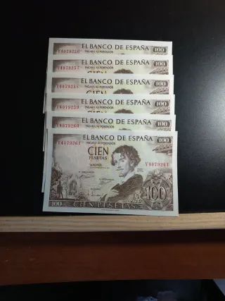 Se vende lote de seis billetes de 100 pesetas del Banco de España. - Billetes con números de serie consecutivos. - Cada billete tiene un valor de 100 pesetas. - Diseño con retrato y paisaje.