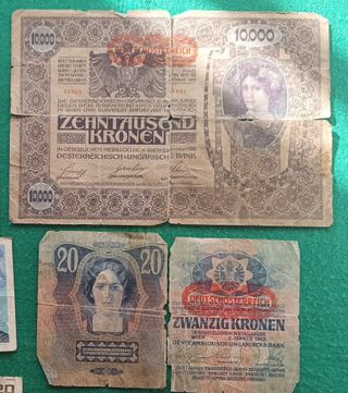 Vendo dos billetes antiguos originales del Imperio Austrohúngaro: 💶 10.000 Kronen (1918) 💶 20 Kronen (1913) Ambos billetes son grandes y muy decorativos, ideales para coleccionistas de numismática o para enmarcar como piezas históricas. 📜 Estado: Deteriorados (con pliegues, roturas y desgaste), pero auténticos. 🔍 Idioma y diseño: Textos en alemán y húngaro, con retratos femeninos clásicos y motivos ornamentales típicos de la época. 🕰 Más de 100 años de antigüedad, emitidos durante los últimos años del Imperio Austrohúngaro. #AustriaHungría #Kronen #billetesdelmundo #coleccionista #antigüedades #imperioaustrohungaro