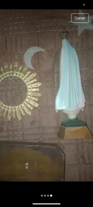 Conjunto religioso de Fátima que incluye una figura y una corona. - Figura de la Virgen de Fátima. - Corona dorada con rayos.