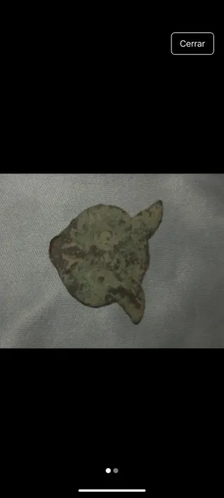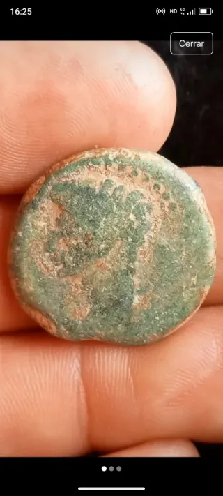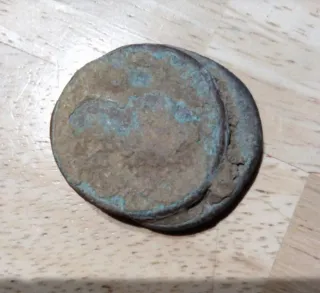 Moneda antigua de la época romana. - Pieza de colección. - Material: Bronce (apariencia). - Diseño desgastado por el tiempo.