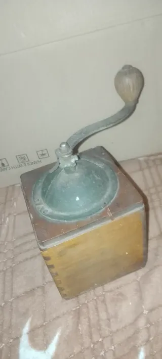 Molinillo de café antiguo con base de madera y mecanismo superior. - Base de madera. - Mecanismo de molienda metálico. - Cajón para el café molido.