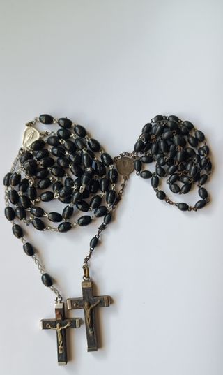 Se vende lote de 2 rosarios antiguos/vintage, ambos con cuentas negras y crucifijo, ideales para coleccionistas, decoración o uso religioso. 📿 Incluye 2 rosarios diferentes: ✅ Rosario 1 Cadena en color plata (aparenta ser aluminio o metal plateado) Crucifijo de estilo antiguo con detalles metálicos Cuentas negras tipo ovaladas ✅ Rosario 2 Cadena envejecida (tono bronce/óxido), con aire muy antiguo Medalla central con imagen religiosa Crucifijo similar con pátina y desgaste natural del tiempo 🎒 Extra: Incluye funda de cuero original (se nota el uso, pero conserva el encanto vintage). #Rosario #Rosarios #RosarioAntiguo #Ros