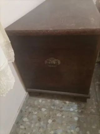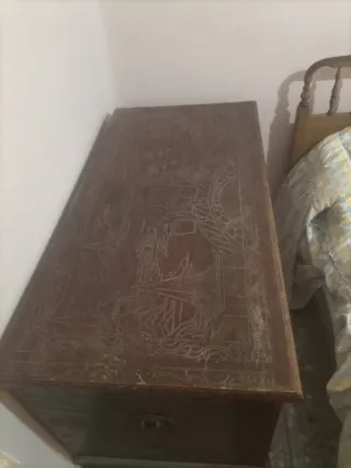 Arcón de madera con un diseño tallado. - Tapa con grabado detallado. - Frontal con tirador.